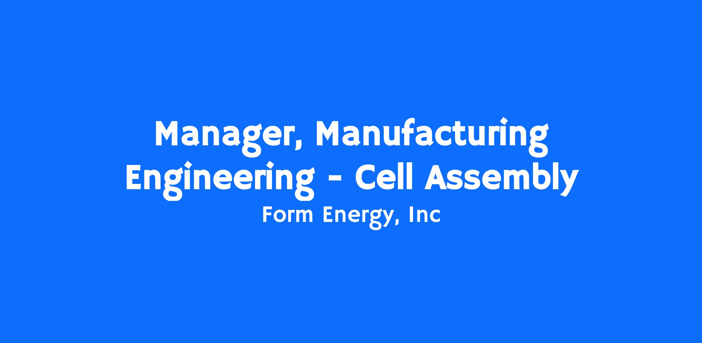 Form Energy is hiring a Manufacturing Engineering Manager to lead our cell assembly area. In this pivotal role, you will bridge the gap between initial product design and high-volume production, overseeing the entire lifecycle of cell assembly processes. You will be responsible for building and mentoring a high-performing engineering team while spearheading the procurement and commissioning of cutting-edge manufacturing equipment.