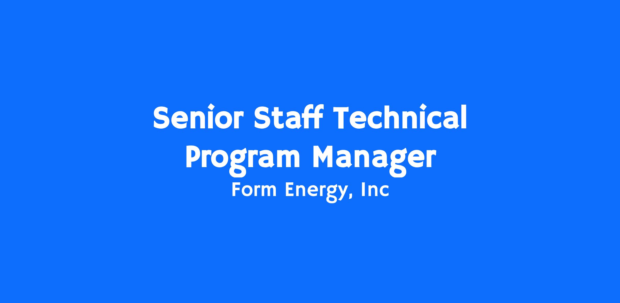 Form Energy is seeking a Senior Staff Technical Program Manager to impact development and validation of our groundbreaking battery technology. As a key member of the Technical Program Management team, you will drive the delivery of our multi-day battery by integrating and managing workstreams across systems architecture, firmware, software, and electrical engineering. You will partner with and influence technical leaders and cross-functional teams to ensure our product meets its requirements and is successfully launched. This is a unique opportunity to apply your technical breadth and program leadership skills to a mission-driven company with world-changing technology.