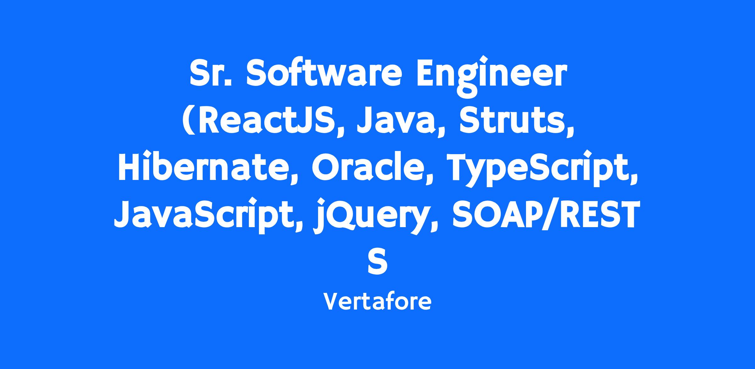 · 4 to 6 years of professional experience ReactJS (version 18), Java, Struts, Hibernate, Oracle 19c, TypeScript, JavaScript, jQuery, SOAP/REST Services, JSP Servlets, Spring, Tomcat, Asynchronous programming, CSS.