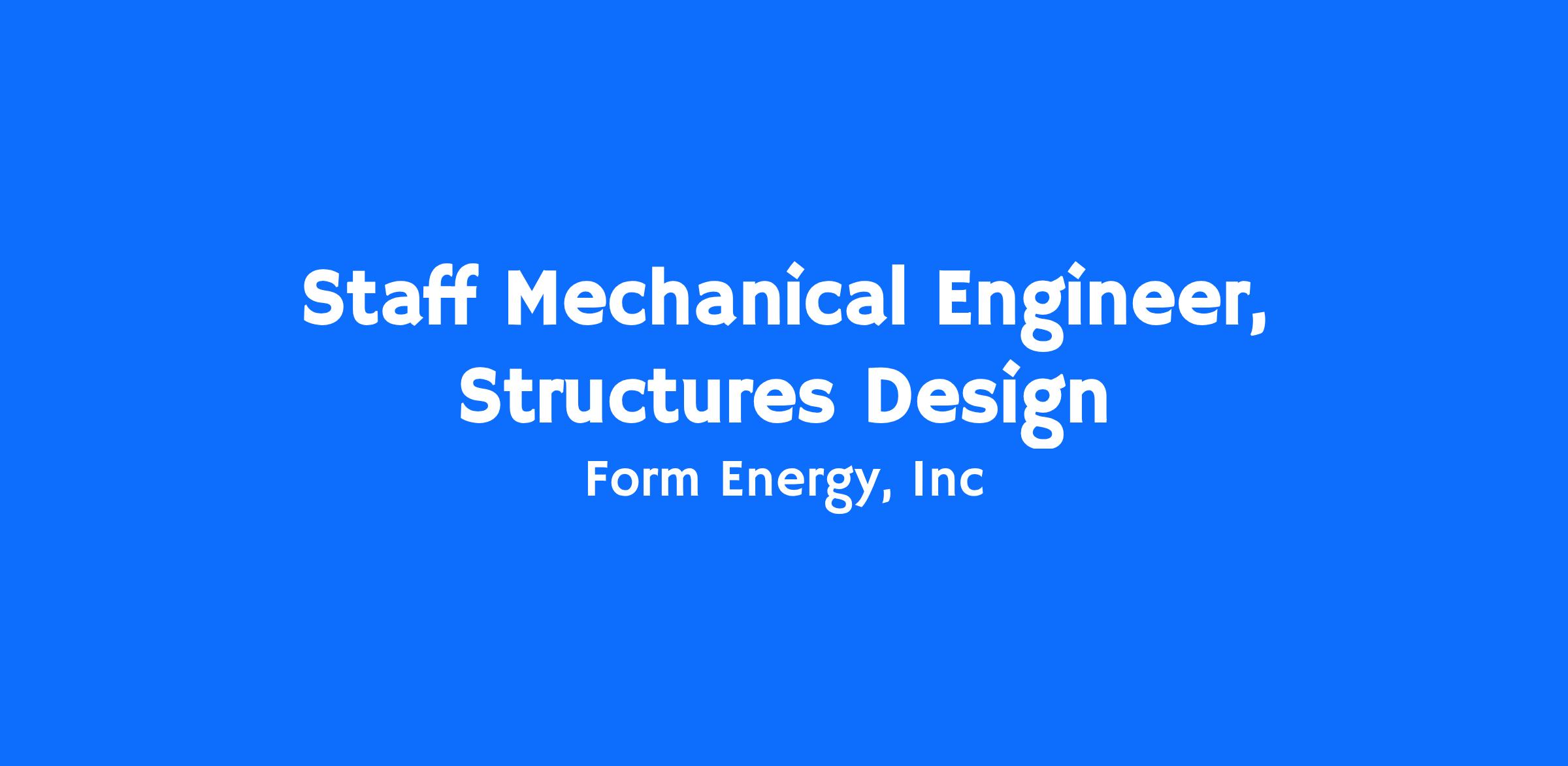 We're seeking a Staff Mechanical Design Engineer to join our team and lead design efforts for crucial parts of our iron-air battery integrated structures. You'll bring components and assemblies from concept to into mass production, with a strong emphasis on structural design, weatherproofing, and manufacturability of metal enclosures. As a problem solver, you'll creatively tackle mechanical design challenges and apply your design knowledge of sheet metal, weldments, plastics, and sealing systems for mass production. You'll work cross-functionally with teams on requirements definition, verification plans, and failure analysis to deliver a design that meets those requirements. Troubleshooting design problems as they arise and working to implement improvements will also be a part of your responsibilities. This is an exciting opportunity to be part of scaling our multi-day energy storage system at Form and contributing to a sustainable future. If this sounds like the perfect opportunity for you, apply now!