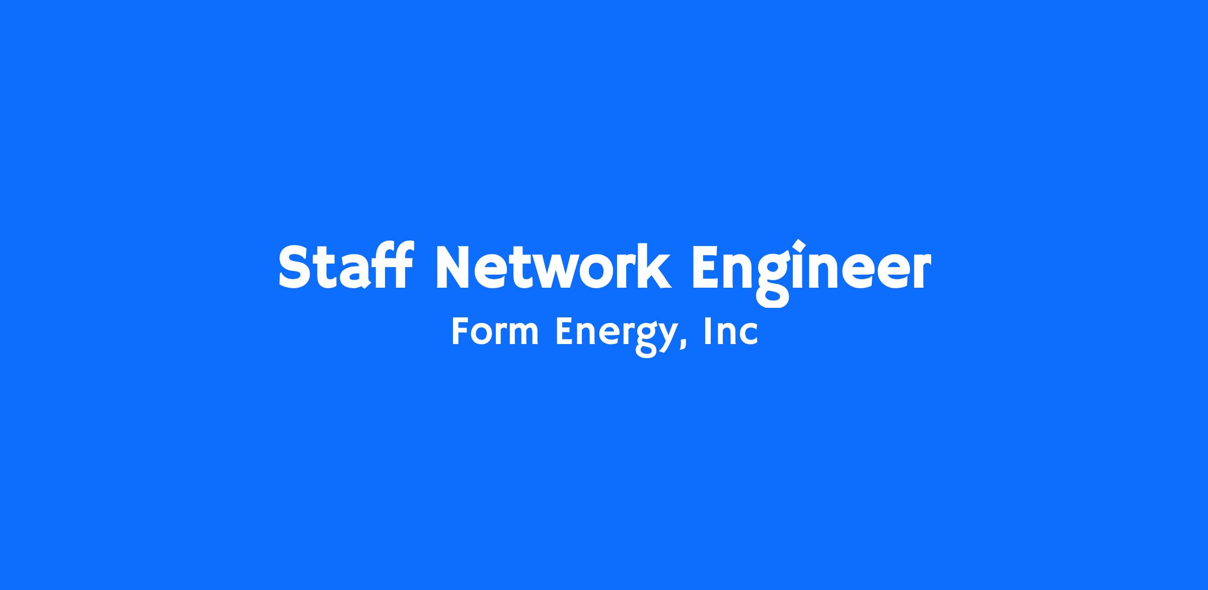 Form Energy is hiring a Staff Network Engineer. The Staff Network Engineer – will be a technical leader responsible for the architecture, design, and reliability of Form Energy’s hybrid enterprise and industrial network environments. This role will focus on securely integrating IT and OT systems while maintaining the high availability, safety, and performance required for manufacturing and operational environments.