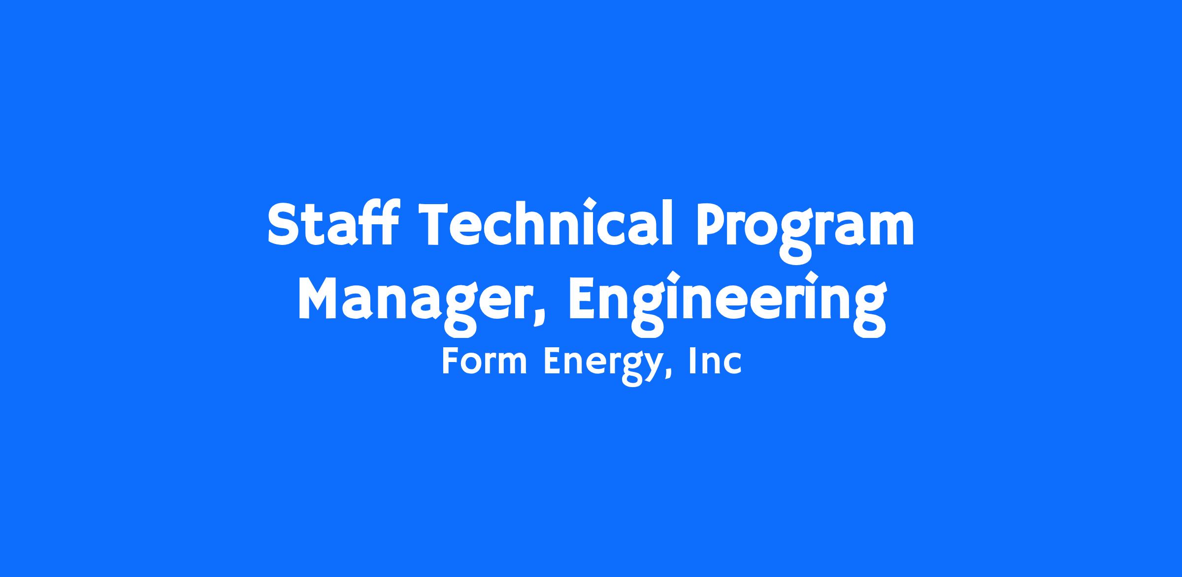 Form Energy is seeking a Staff Technical Program Manager to impact development and validation of our groundbreaking battery technology. As a key member of the Technical Program Management team, you will drive the delivery of our multi-day battery by integrating and managing workstreams across systems architecture, firmware, software, and electrical engineering. You will partner with and influence technical leaders and cross-functional teams to ensure our product meets its requirements and is successfully launched. This is a unique opportunity to apply your technical breadth and program leadership skills to a mission-driven company with world-changing technology.