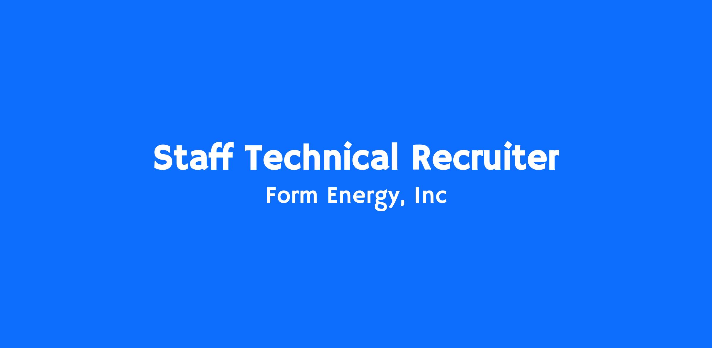 Form Energy is hiring a Staff Technical Recruiter to serve as a strategic talent partner for our world-class Engineering organization! You will be at the forefront of our growth, navigating the talent landscape of the energy industry to find the experts needed to help scale our pioneering multi-day storage systems. We are seeking a domain expert in hardware who can act as a recruiting partner to our leadership and help scale the teams responsible for mechanical, electrical, and product innovation. This is a high-impact opportunity to join a high-performing TA team and play a pivotal role at a pivotal time in Form Energy’s journey to transform America’s electric grid!